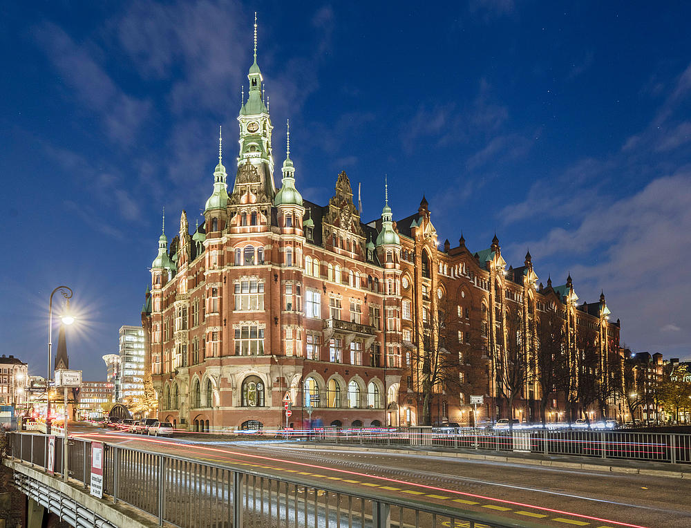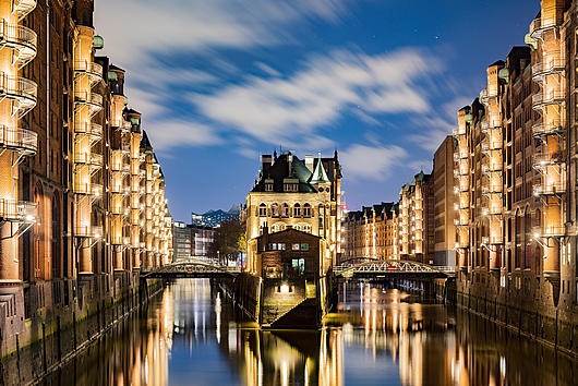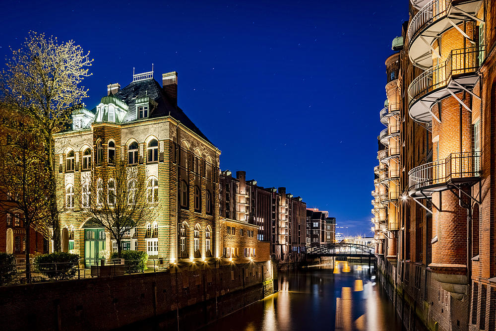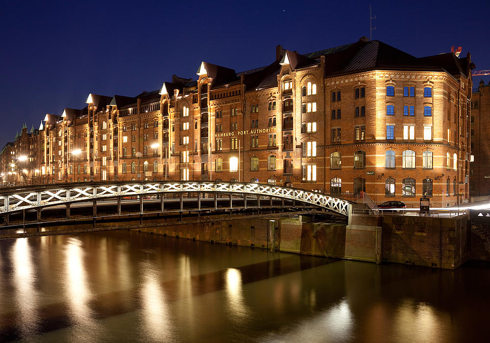 The illuminated Speicherstadt historical warehouse district in Hamburg (Bei St. Annen 1, Hamburg)