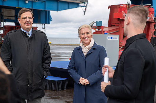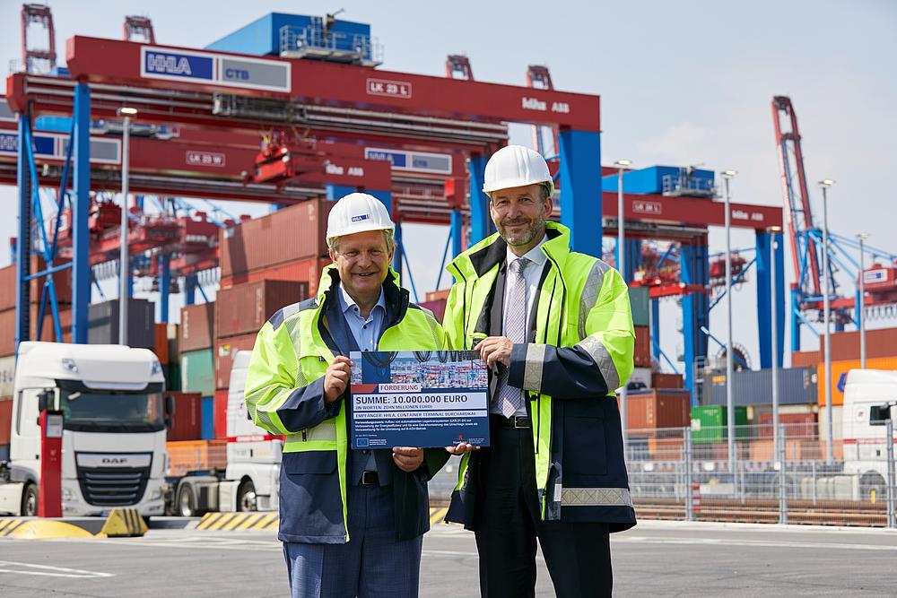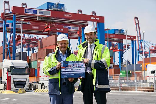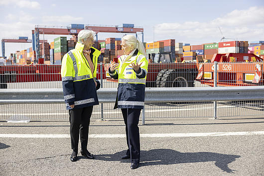 Senator of Economic Affairs Dr. Melanie Leonhard and Jeroen Eijsink (CEO of HHLA) at Container Terminal Altenwerder (CTA).