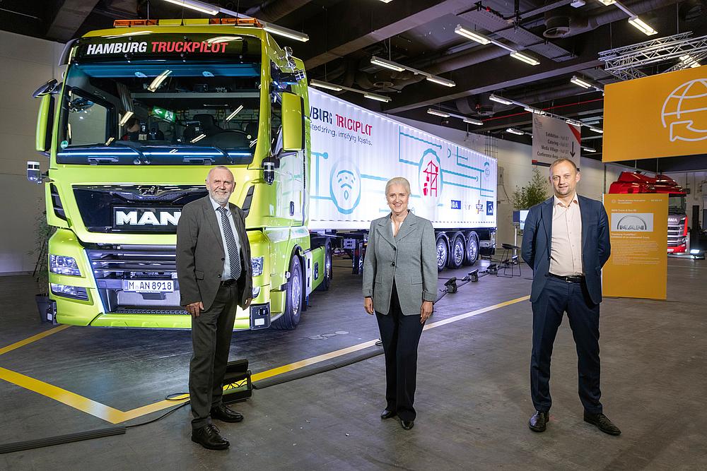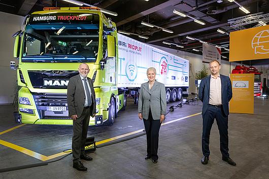 MAN Truck & Bus and Hamburger Hafen und Logistik AG (HHLA) as well as logistics partner Spedition Jakob Weets have successfully completed the Hamburg TruckPilot joint project, setting a milestone in automated container transport. From left to right: Jakob Weets, Managing Director Spedition Weets, HHLA Executive Board Chairwoman Angela Titzrath and MAN Truck & Bus Senior Vice President - Head of Automation Mikael Edstam presented the project results at the ITS World Congress on 13 October.