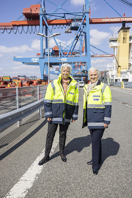 Chancellor Dr Angela Merkel (on the right) and the Chairwoman of HHLA’s Executive Board, Angela Titzrath, on top of a container gantry crane at HHLA Container Terminal Altenwerder (CTA) in Hamburg.