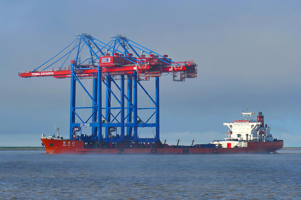 The “Zhen Hua 26” is delivering two huge gantry cranes for HHLA Container Terminal Burchardkai (CTB) in Hamburg.