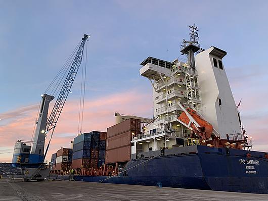 The "OPS Hamburg" is the first container ship to be handled by HHLA PLT in Trieste, Italy.