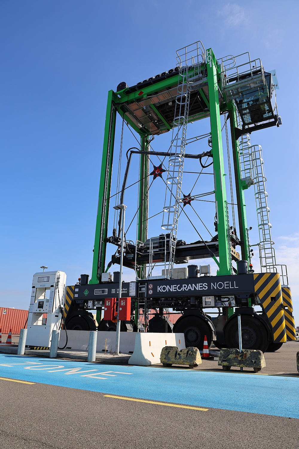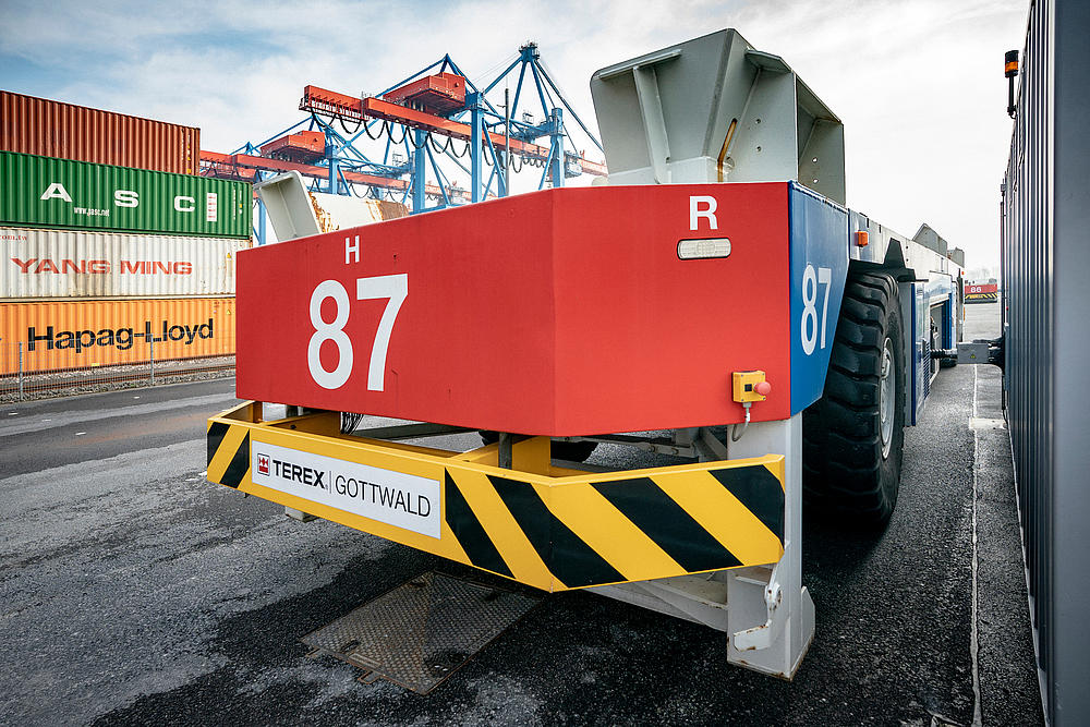 The first straddle carriers with environmentally friendly hybrid engines in the Port of Hamburg are now transporting containers at the HHLA Terminal Tollerort (CTT), produced by Konecranes Noell.