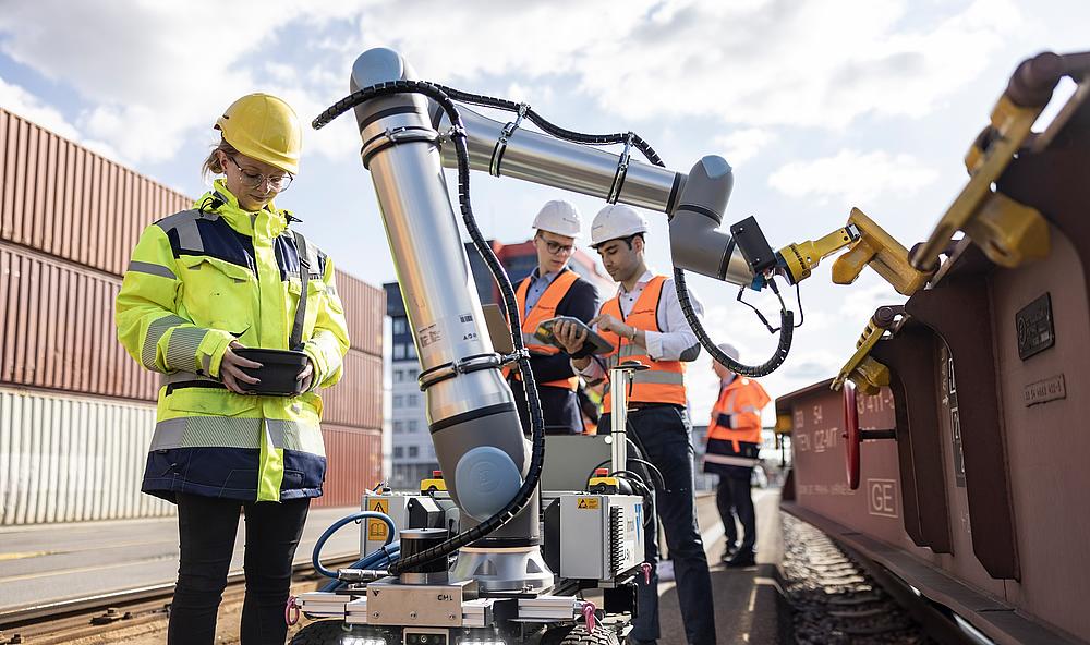 Mobile robot for automating the relocating of pins on container wagons at HHLA Container Terminal Tollerort.