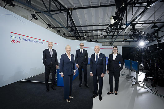HHLA Executive Board with Supervisory Board Chairman at the 2025 Annual General Meeting (from left to right: Executive Board member Jens Hansen, Chief Executive Officer Angela Titzrath, Executive Board member Torben Seebold, Supervisory Board Chairman Prof. Dr. Rüdiger Grube and Executive Board member Annette Geiß)